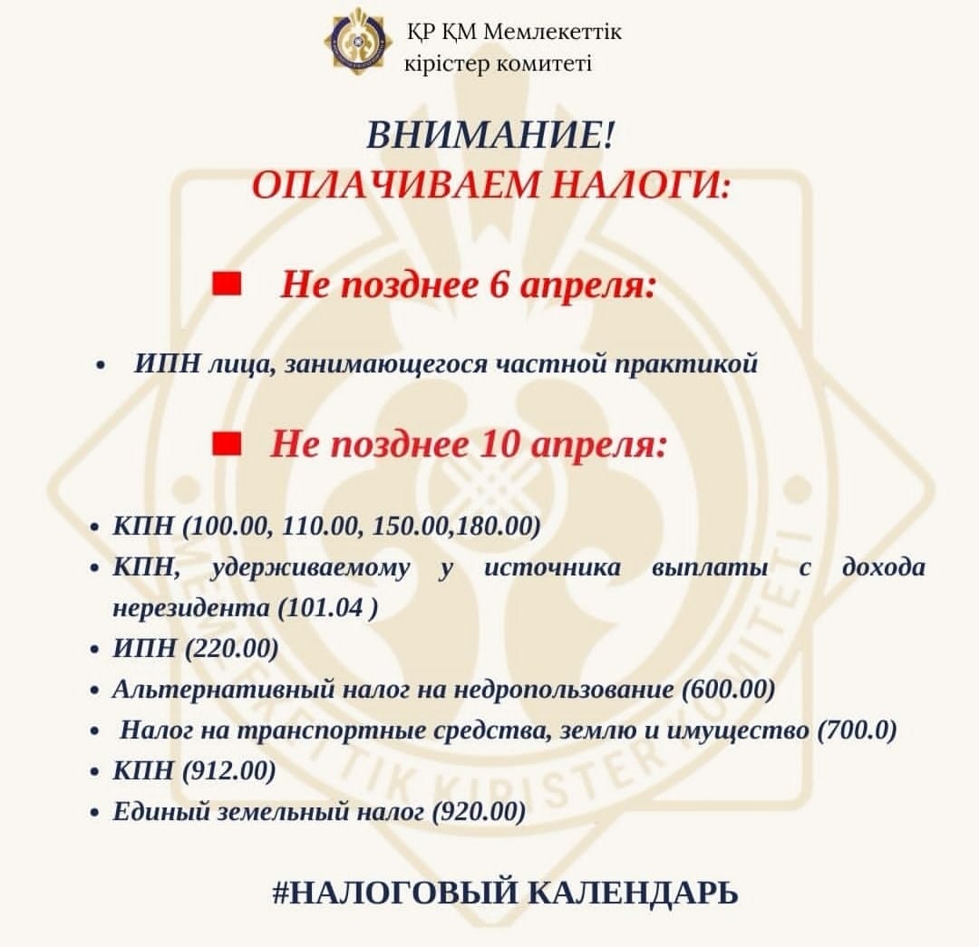 Напоминаем, что приближается срок сдачи налоговых отчетностей. Не забывайте своевременно исполнять свои налоговые обязательства, рекомендуем заранее подготовить и подать необходимые документы.
