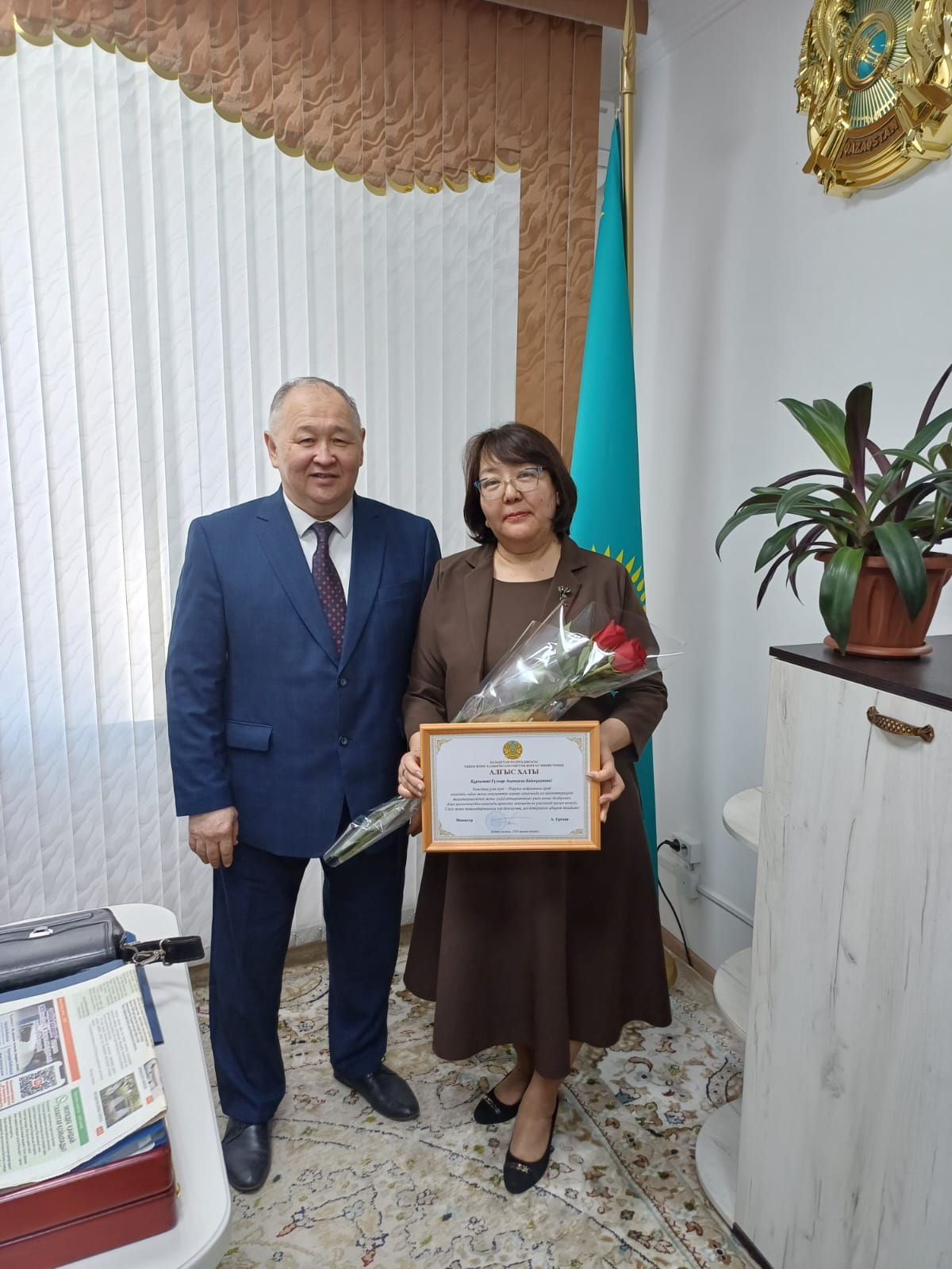 Руководитель Департамента Комитета регулирования и контроля в сфере социальной защиты населения по Северо-Казахстанской области Омаров М.К. за добросовестный труд и внесенный вклад в сфере социальной защиты населения вручил «Курмет грамотасы» Министра труда и социальной защиты населения Республики Казахстан главному специалисту отдела пенсионного и социального обеспечения Нурсеитовой Маншук Макпозовне и «Алгыс Хаты» Министра труда и социальной защиты населения Республики Казахстан руководителю отдела методологии и контроля медико-социальной экспертизы Баймукановой Гульнаре Акановне.