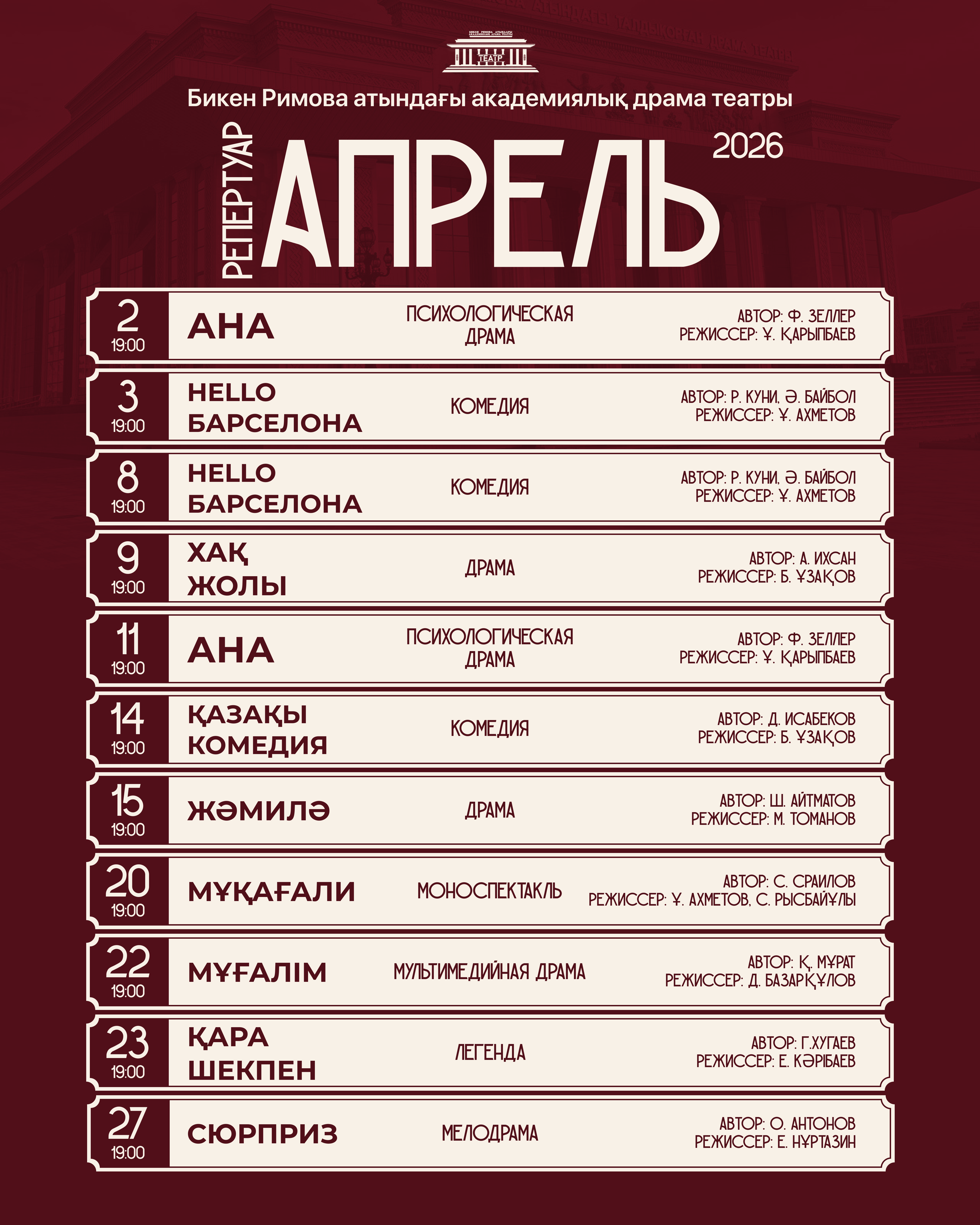 Репертуар постановок академического театра имени Бикен Римовой на апрель