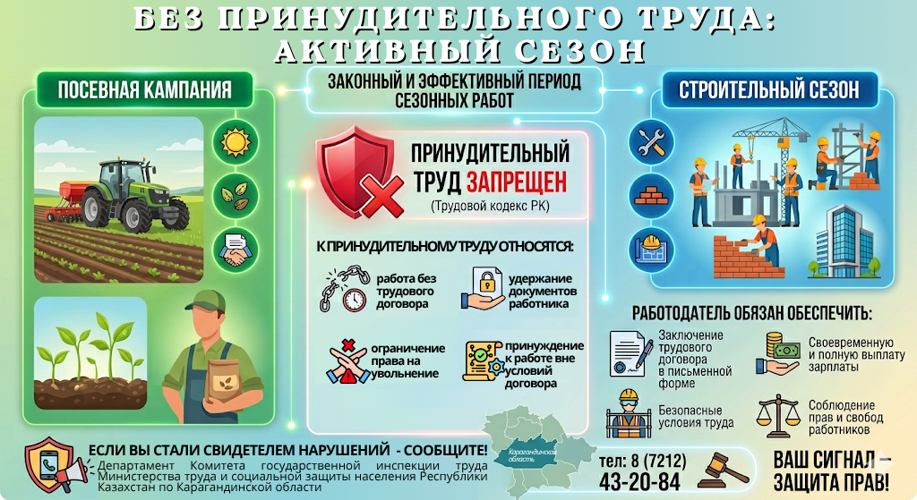 Если вы стали свидетелем нарушений — обратитесь в Департамент Комитета государственной инспекции труда Министерства труда и социальной защиты населения Республики Казахстан по Карагандинской области или позвоните по номеру 8 (7212) 43-20-84.