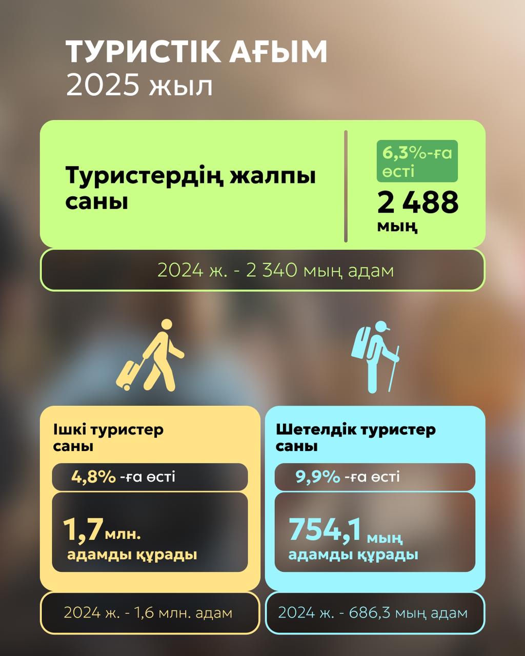 В 2025 году Алматы посетили 2 487 889 человек, что на 6,3% больше по сравнению с 2024 годом (1 729 601 человек). Из них 754 тысячи составили иностранные туристы, продемонстрировав рост на 9,9%, а 1,7 млн – внутренние путешественники, увеличение составило 4,8%.