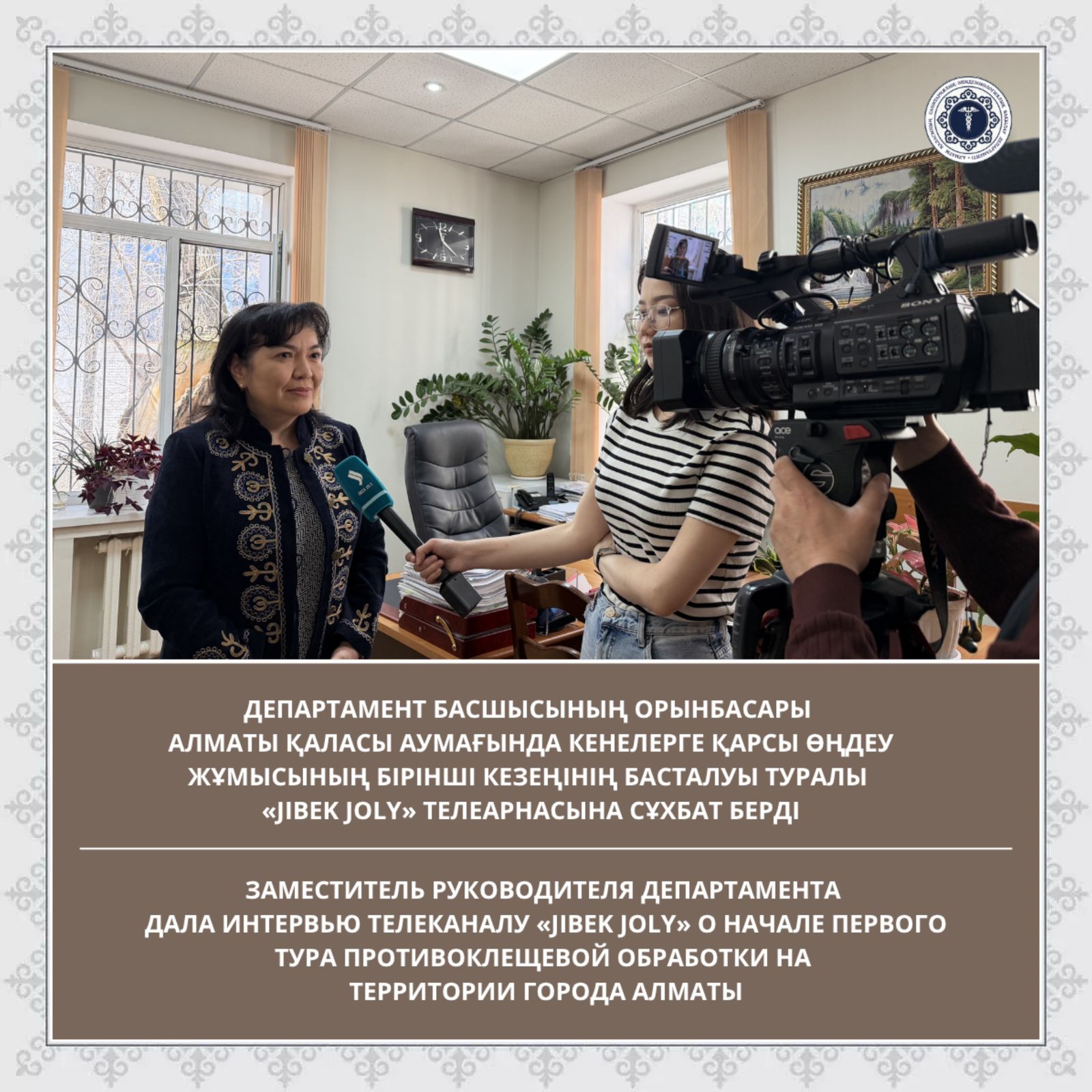 30 марта текущего года заместитель руководителя Департамента санитарно-эпидемиологического контроля города Алматы Калыкова Асель Токановна дала интервью телеканалу «JIBEK JOLY» о начале первого тура противоклещевой обработки на территории города Алматы.