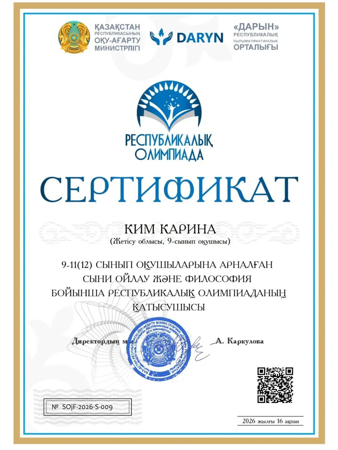 На IV (республиканском) этапе республиканской олимпиады по предметам «Критическое мышление» и «Философия» среди учащихся 9–11 (12) классов ученица 9 «Б» класса средней школы имени Р. Кошкарбаева Ким Карина была награждена сертификатом.