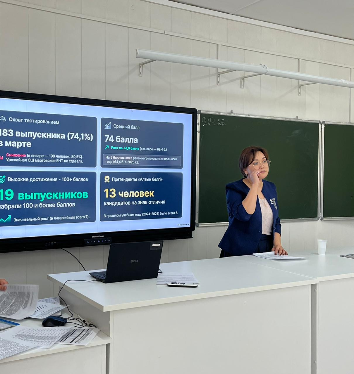Заведующая РМК Жаманбаева Р.К. и методист Баймаганбетова И.Е. представили детальный анализ качества знаний по предметам за три четверти и обсудили текущие результаты ЕНТ-2026.