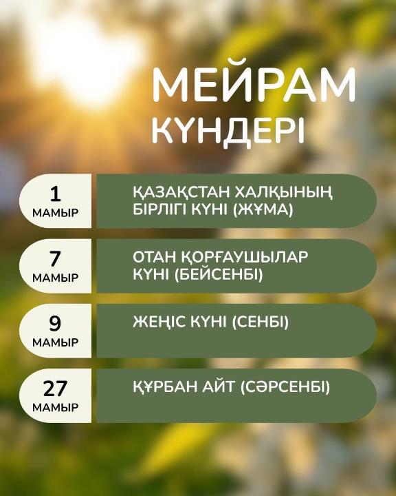В мае 2026 года казахстанцев ожидают дополнительные выходные дни в связи с государственными праздниками. График отдыха формируется с учётом праздничных дат и переноса выходных дней.
