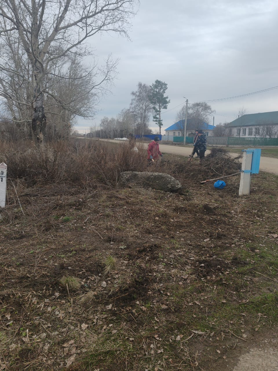 Рабочие по благоустройству проводят очистку территории от сухой растительности и мусора , выполняя работы по наведению санитарного порядка.