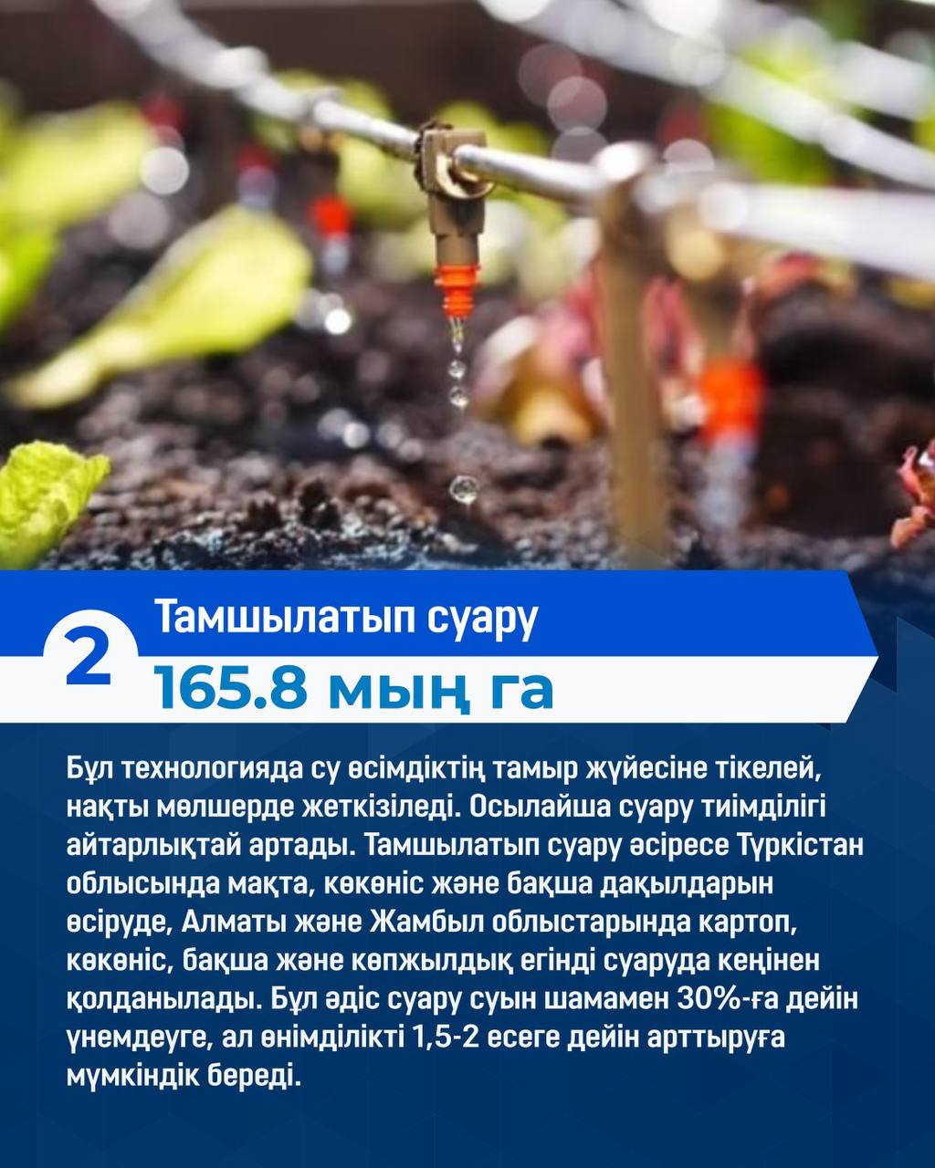 В рамках выполнения поручения Главы государства по внедрению водосберегающих технологий, государство увеличило возмещение затрат фермеров с 50% до 80%. Теперь господдержка покрывает часть расходов на инфраструктуру для забора воды, а также на покупку и установку систем полива.