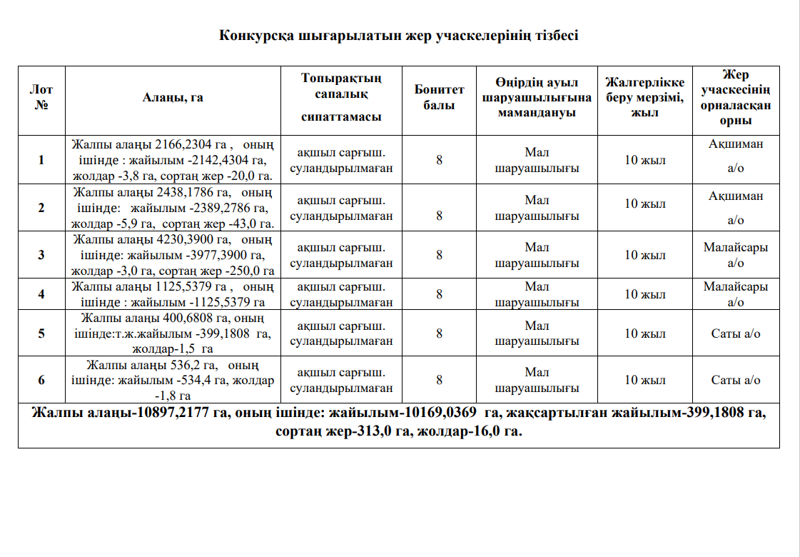 ГУ «Отдел земельных отношений Майского района» сообщает, что 27 апреля 2026 года в 15:00 часов состоится конкурс по предоставлению права временного возмездного землепользования (аренды) для ведения крестьянского или фермерского хозяйства, сельскохозяйственного производства из земель сельскохозяйственного назначения на общей площади 10897,2177 га.В том числе пастбища –10169,0369 га, пастбища к.у.-399,1808 га, солончак-313,0 га, дороги-16,0 га.