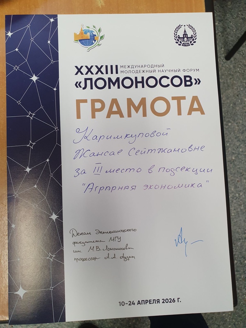 Сотрудница Бюро национальной статистики АСПиР РК, магистрантка 2 курса Казахстанского филиала Московского государственного университета имени М.В. Ломоносова Жансая Каримкулова заняла III призовое место, представив результаты своего исследования.