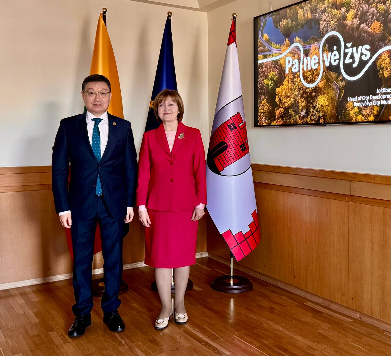 Паневежис, 16 апреля 2026 года — Посол Казахстана в Литве Т. Уразаев провёл встречу с мэром г. Паневежис Лоретой Масилёнене.