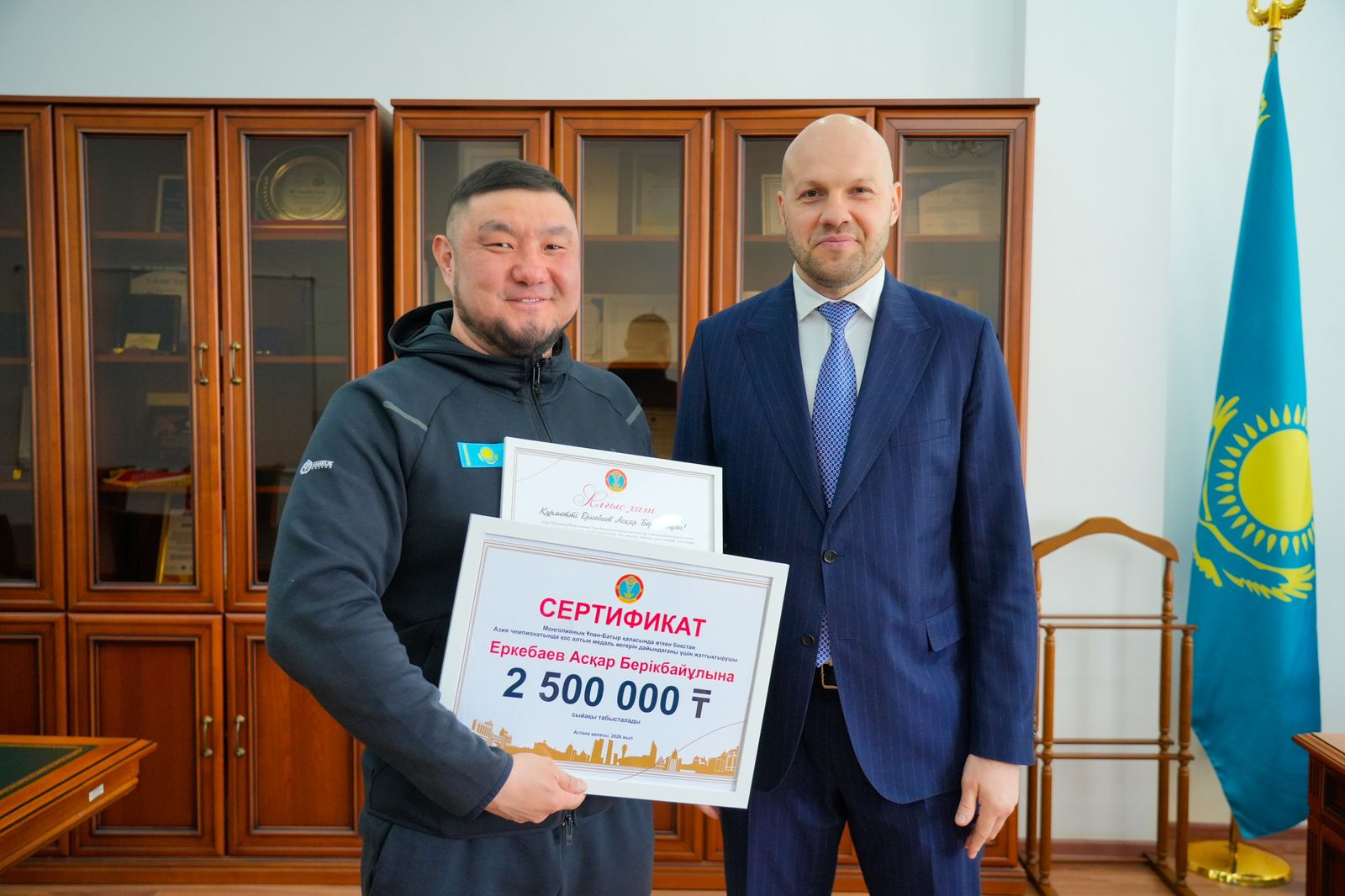 Руководитель Управления физической культуры и спорта города Астаны Василий Левит принял победителей и призёров чемпионата Азии среди взрослых, который прошёл в Улан-Баторе (Монголия), а также их личных тренеров.