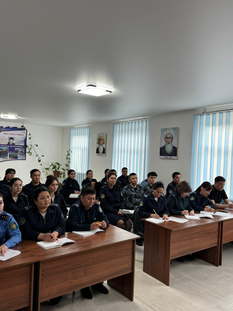 В Департаменте уголовно-исполнительной системы по Жамбылской области в целях повышения профессиональной подготовки сотрудников было проведено плановое учебное занятие. Тема занятия охватывала вопросы «выполнения воинского приветствия, выхода из строя и возвращения в строй, прибытия к начальнику и убытия от него».