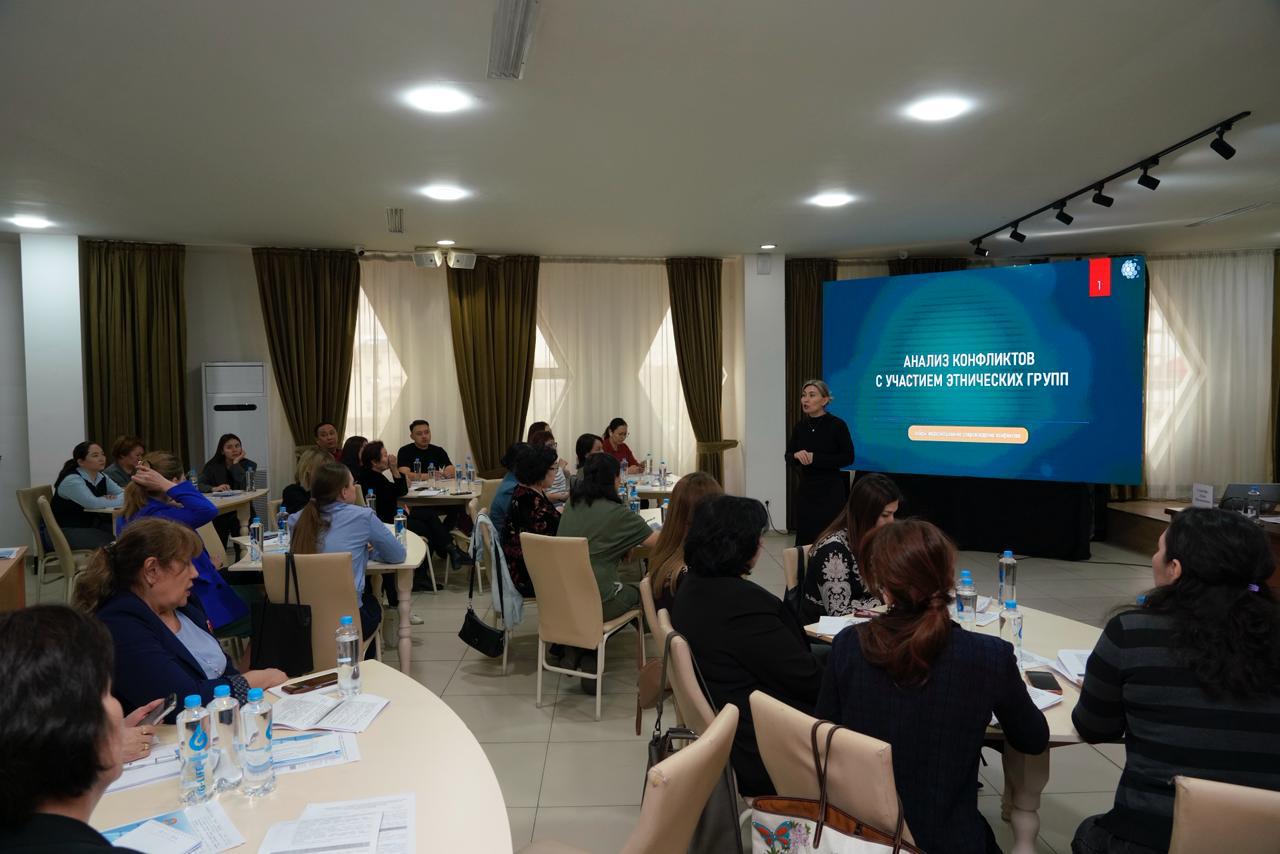 Во второй день акцент был сделан на этномедиации и межведомственном взаимодействии. Директор Института прикладных этнополитических исследований Луиза Узарова провела интерактивную лекцию с кейс-стади реальных конфликтов, а преподаватель ЕНУ Бахыт Тусупбекова — тренинг по переводу конфликта в конструктивный диалог.
