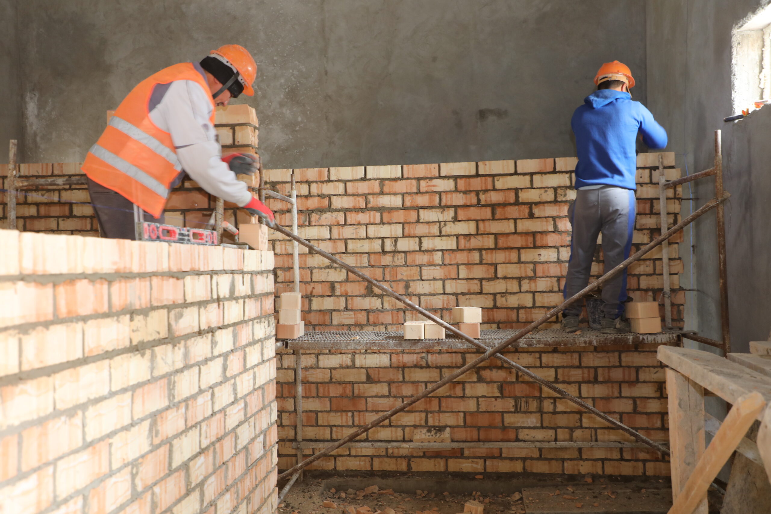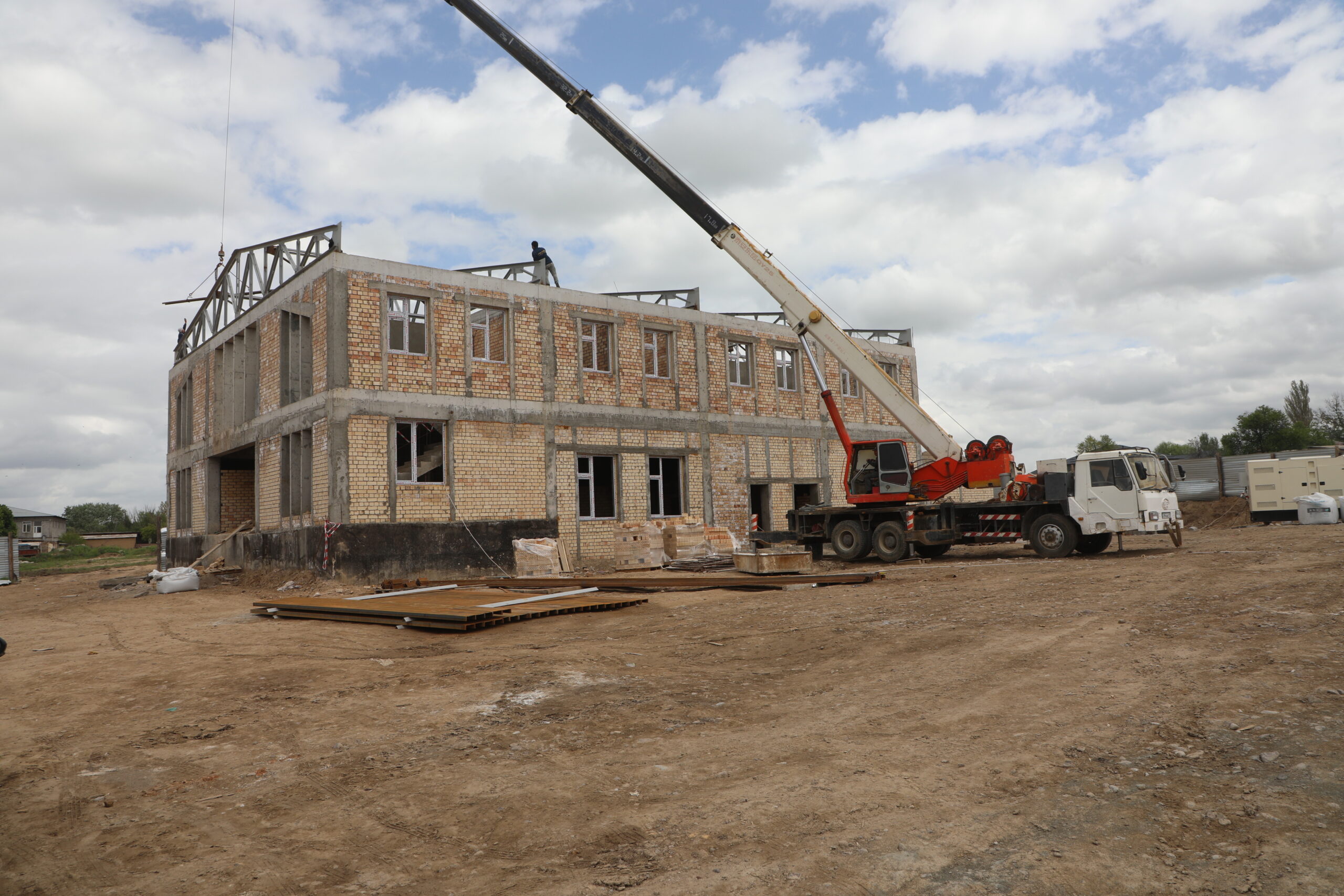 В настоящее время на строительной площадке задействованы 16 рабочих и 2 единицы специальной техники. Подрядной организацией «ST-SERVICE KZ» выполняются внутренние штукатурные работы, сварка и монтаж ферм. Внутренние электрические сети полностью проведены, установка окон завершена.