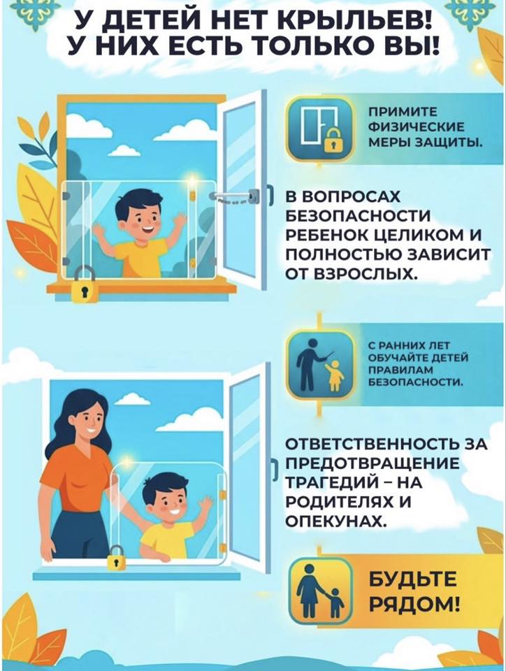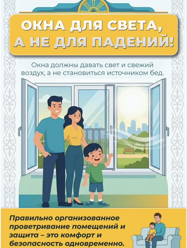 В рамках реализации концепции «Дети Казахстана» в стране началась масштабная информационная кампания «Окно -SAFE». Цель инициативы — предотвращение несчастных случаев и недопущение выпадения детей из окон. Согласно статистике, по итогам 2025 года такие случаи увеличились в 1,8 раза по сравнению с 2023 годом. В группе риска в основном дети в возрасте от 2 до 5 лет.