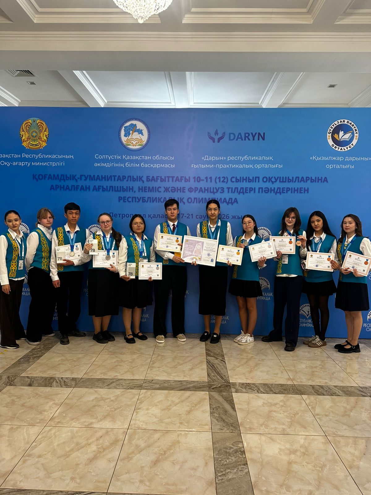 По итогам республиканской олимпиады золотые медали и дипломы І степени завоевали учащаяся 11 класса гимназии № 3  Кожабекова Тахмина (французский язык, учитель –  К.К. Батаева) и учащийся 11 класса  лицея-интерната «Білім-Инновация» для юношей г. Экибастуза Арынов Ернар (английский язык, учитель – Ж.М.Уятова).