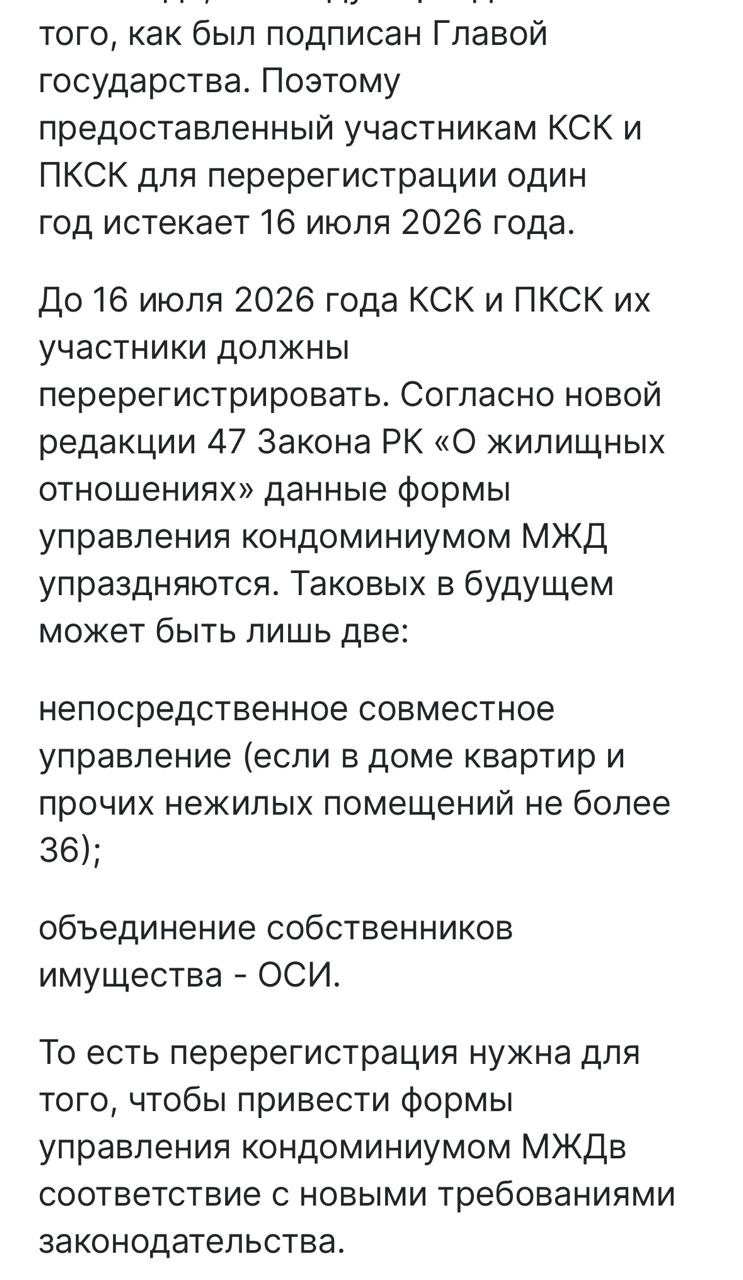 Нынешние КСК, а также потребительские кооперативы собственников квартир должны быть перерегистрированы до 17 июля 2026 года. В противном случае они будут ликвидированы, после чего жилищная инспекция назначит многоквартирным жилым домам (МЖД) временную управляющую компанию.