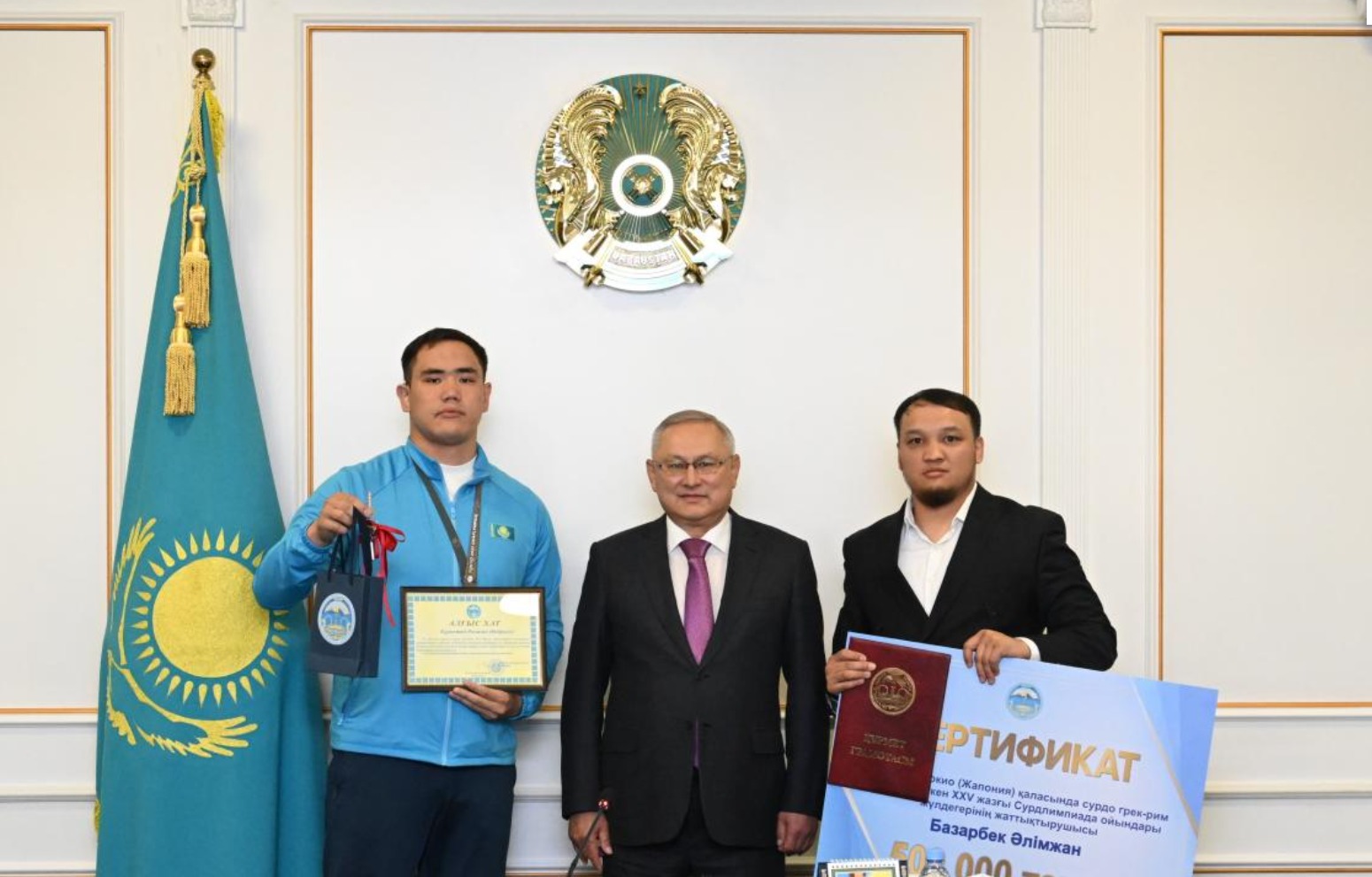 – Рамазан Абдрасил является и чемпионом Кубка Республики Казахстан по сурдо греко-римской борьбе, прошедшего недавно в городе Шымкенте. Высокие достижения Рамазана — это результат многолетнего упорного труда, а также профессионализма и неустанной работы его тренера. В этой связи выражаю искреннюю благодарность и тренеру Базарбеку Алимжану за подготовку такого талантливого спортсмена и истинного патриота страны, а также за вклад в развитие отечественного спорта, – сказал Б. Исабаев, вручив чемпиону ключи от однокомнатной квартиры в новом жилом доме города Талдыкоргана, а тренеру – денежный сертификат.