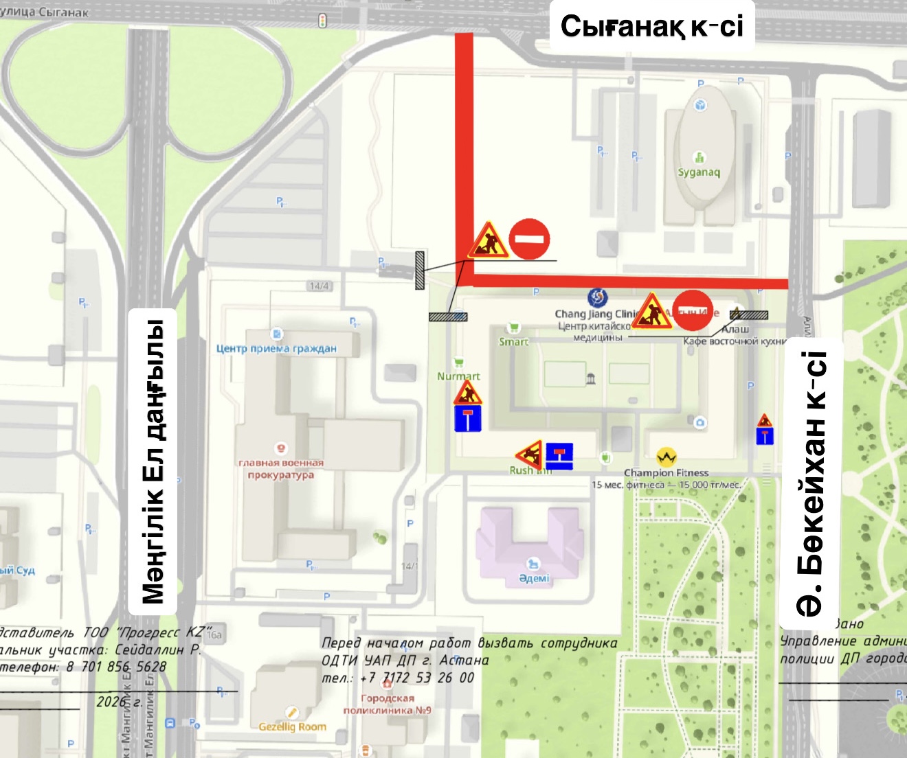 Информируем жителей и гостей города о том, что в рамках реализации проекта «Строительство улиц в районе пересечения проспекта Мәңгілік Ел и улицы Сыганак» с 26 апреля по 1 сентября текущего года будет полностью перекрыто движение между БЦ «Syganaq» и ЖК «Ишим». Будут проводиться работы по стриотелдьству улицы с устройством инженерных сетей.
