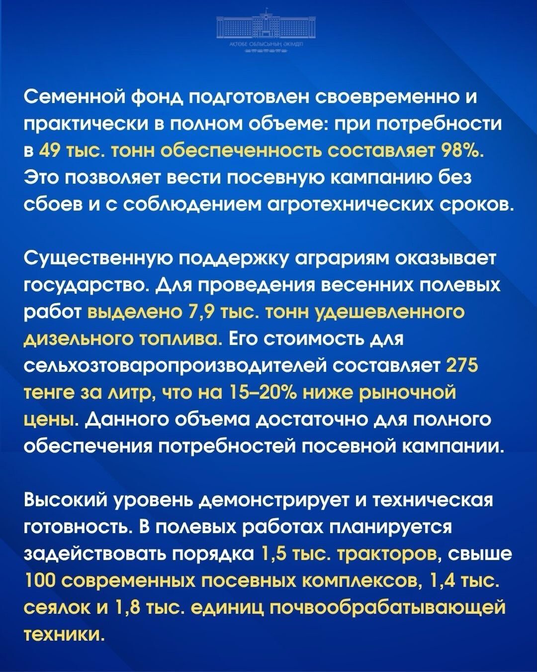 ⛽ Меры государственной поддержки также дают результаты. Для своевременного и эффективного проведения весенних полевых работ выделено 7,9 тыс. тонн удешевленного дизельного топлива. Цена его поставки для сельхозпроизводителей составляет 275 тенге за литр, что на 15–20% ниже рыночной стоимости. Выделенного объема топлива достаточно для полного обеспечения посевной кампании.