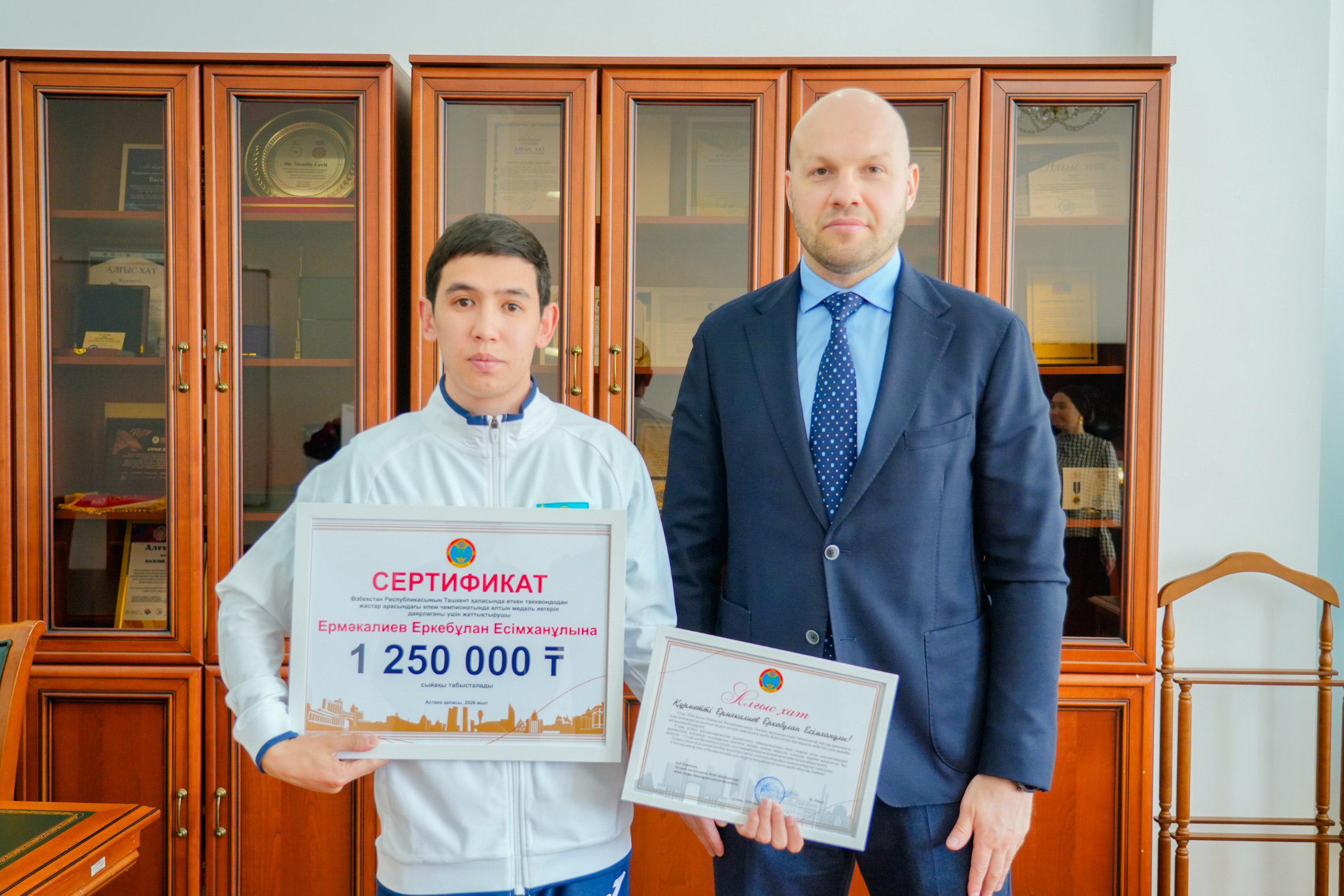 Руководитель Управления физической культуры и спорта города Астаны Василий Алексеевич принял чемпионку мира по таеквондо (WT) среди юниоров Айым Серикбаеву и её личного тренера Еркебулана Ермекалиева.
