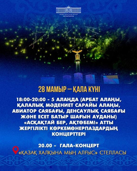 28 мая с 18:00 на пяти площадках города (площади Арбат, Городского дома культуры, в парке Авиаторов, парке Здоровья и в микрорайоне Есет батыр) пройдут концерты под названием «Асқақтай бер, Ақтөбем!». В 20:00 на площади у стелы «Қазақ халқына мың алғыс» состоится гала-концерт.