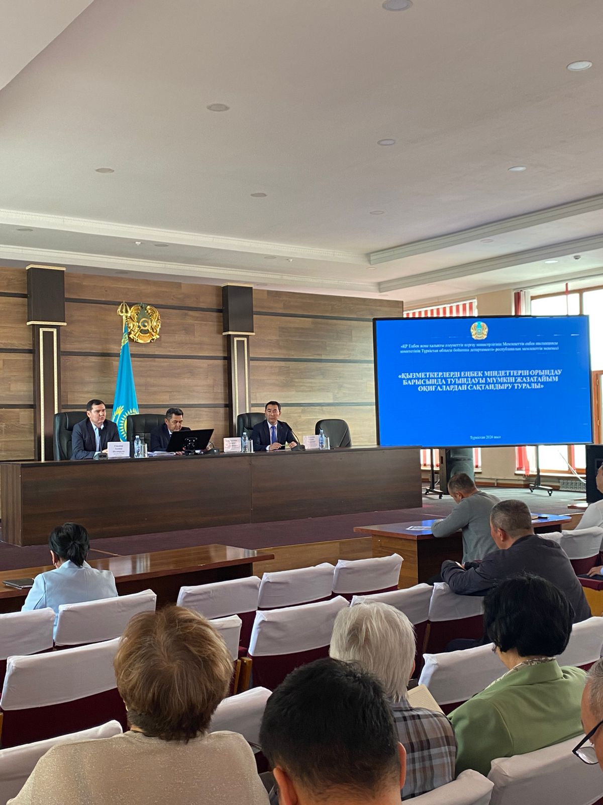 🔹 В ходе встречи с докладами о страховании работников от несчастных случаев, которые могут возникнуть при исполнении ими трудовых обязанностей выступили государственный инспектор труда Департамента Смадияр Алдияр Шаниярович, ответственный представитель филиалов АО “КСЖ” Государственная аннуитетная компания” в г. Шымкент и Туркестанской области Руслан Муратович.